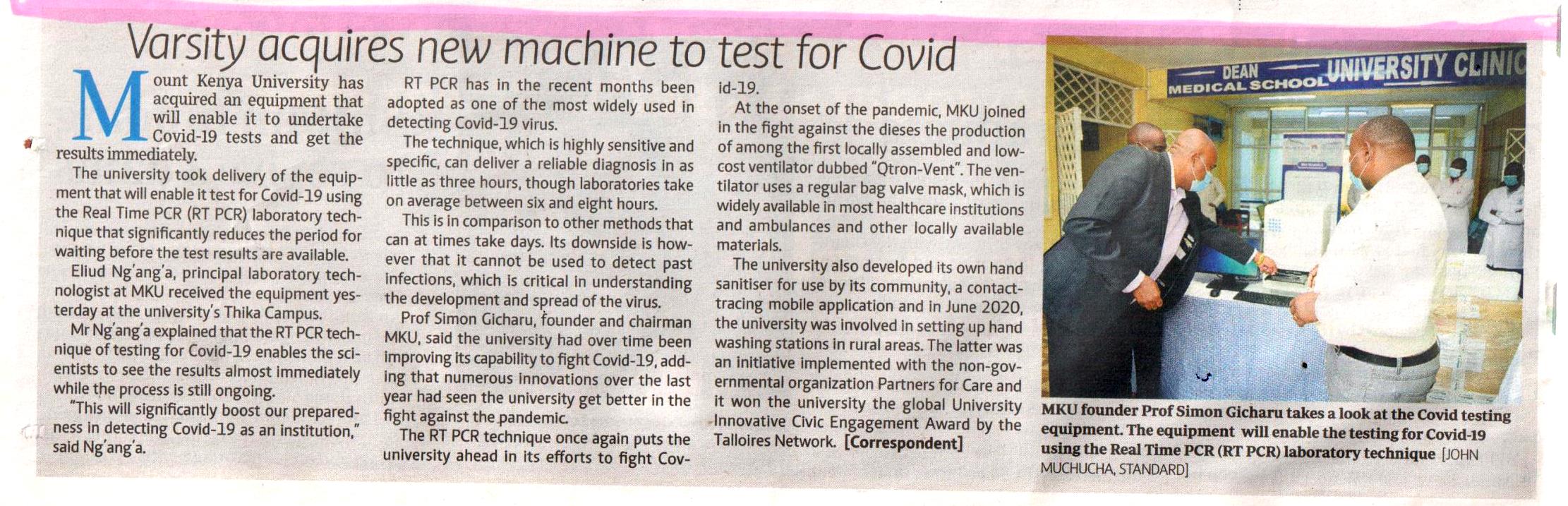 Mount Kenya University strengthens capacity to fight Covid-19 by acquiring equipment that enables it to undertake Covid-19 tests and get the results in real time. The university took delivery of the Real Time PCR (RT PCR) equipment as a major accomplishment as it will enable it to test for Covid-19 in real time reducing significantly the results waiting period. MKU principal laboratory technologists, Mr. Eliud Ng’ang’a, while receiving the equipment at Main Campus, said “ The RT PCR Covid Machine will greatly assist the students and staff of the university easily know their Covid-19 status” .