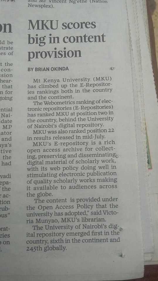 MKU e-content provision climps up in the global web ranking Mt Kenya University (MKU) has climbed up the E-repositories rankings both in the country and the continent. The Webometrics ranking of electronic repositories (E-repositories) has ranked MKU at position two in the country, behind the University of Nairobi’s digital repository. MKU was also ranked position 22 in results released in mid-july. MKU’S E-repository is a rich open access archive for collecting, preserving and disseminating digital material of scholarly work, with its web policy doing well in stimulating electronic publication of quality scholarly works making it available to audiences across the globe. The content is provided under the Open Access Policy that the university has adopted,” said Victoria Munyao, MKU’S librarian. The University of Nairobi’s digital repository emerged first in the country, sixth in the continent and 245th globally.